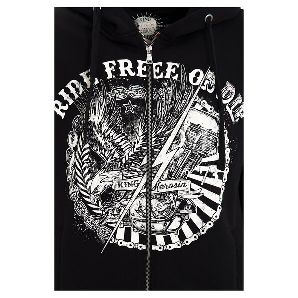 Ride Free blackThe hoodie jacket from King Kerosin comes with an authentic front print in biker look! The sweatware made of cotton mix is super comfortable and meets all requirements of an uncomplicated casual look. Sporty details like the metal zipper and the wide cords complete the sweat jacket. The small logo label on the hem sets additional accents. Thus the hoodie of King Kerosin is an indispensable basic for leisure - not only for motorcycle fans.