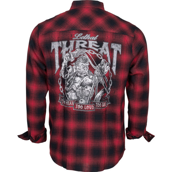 From the front, the Lethal Threat "Riding Gorilla" looks like a classic lumberjack shirt, with two chest pockets and a small embroidered Lethal Threat logo on the left. But the back of this shirt sports a fierce-looking gorilla. "Too mean, too loud, too bad!" That's the message. And why not? It simply looks great, after all!