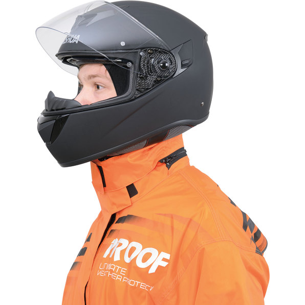 The new waterproof, breathable one-piece rainsuit from Proof is made of very tear-resistant and hard-wearing polyamide fabric. Yet it is also soft and lightweight, so you'll hardly notice you're wearing it over your motorbike gear. The hood, which stows away in the edge of the collar and is also detachable, is worn under your helmet and keeps your neck dry. Small pack size in lightweight carrying bag!